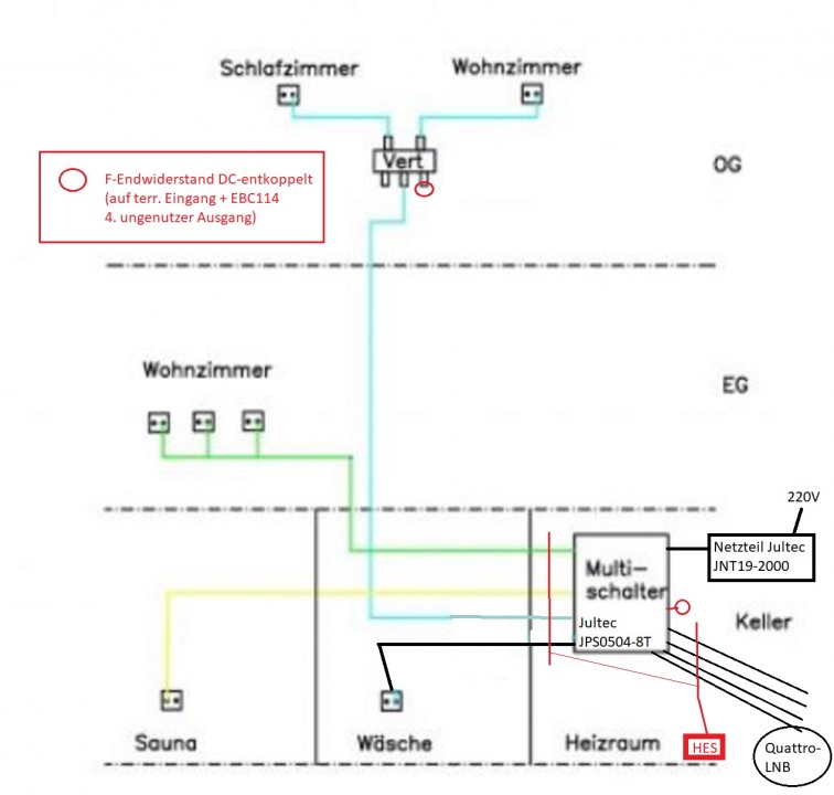 Sehr gut, dann ist das alles wie zuvor und vollkommen unabhängig vom neu geplanten Aufbauhweilaender hat geschrieben:Es handelt sich um ein Haus mit 3 Etagen, die vom Keller aus verkabelt sind. Der vorhandene Verteiler im Keller, der die Etagen versorgt hat, wird nur mehr ausschließlich für die Verbindung zum UPC-Kabelnetz für das Internet genützt und vom neuen Satellitennetz völlig abgekoppelt.