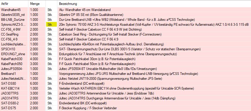 Habe jetzt noch die Stecker für das LNB-Kabel in der Liste hinzugefügt. Ich hoffe, dass jetzt alles stimmt. Wenn ja, dann würde ich die Teile gerne bestellen. Freundliche Grüße