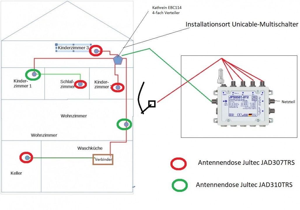 Alternativ gäbe es hier noch den Jultec JPS0502-8T (benötigt auch das Netzteil dazu, Jultec JNT19-2000). Der hätte die doppelte Anzahl von Tuner-Versorgungen, also 2 Ausgänge mit JE 8 Umsetzungen drauf .... dann könnte man den Strang nach unten an einen extra Ausgang davon hängen und die komplette obere Hälfte vom Haus an den 2. Ausgang (dann auch über den EBC114 Verteiler an dem dann aber ein Ausgang frei bleiben würde, den dann auch mit dem von ihnen schon genannten F-Endwiderstand DC-entkoppelt abschließen, also den offenen Ausgang vom EBC-Verteiler).Ikheo hat geschrieben:1x Jultec JPS0501-8T2