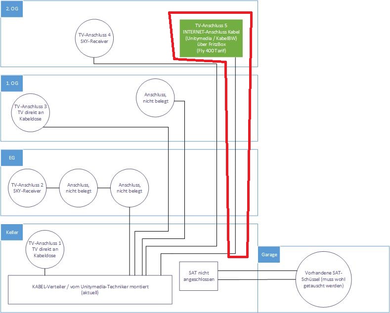 Leider weiß ich dann aber nicht wie im 2. OG die Verkabelung ist. Dort sind aktuell 2 TV-Dosen. An der einen hängt der SKY-Receiver, an der anderen die FritzBox. Ob nun ein Kabel direkt ins 2. OG führt oder zwei Kabel liegen ist nicht ersichtlich. Leider hat der Unitymedia-Techniker auch die Kabelbeschriftung abgeschnitten :cry: sodass nicht mehr ersichtlich ist welches Kabel wohin führt...