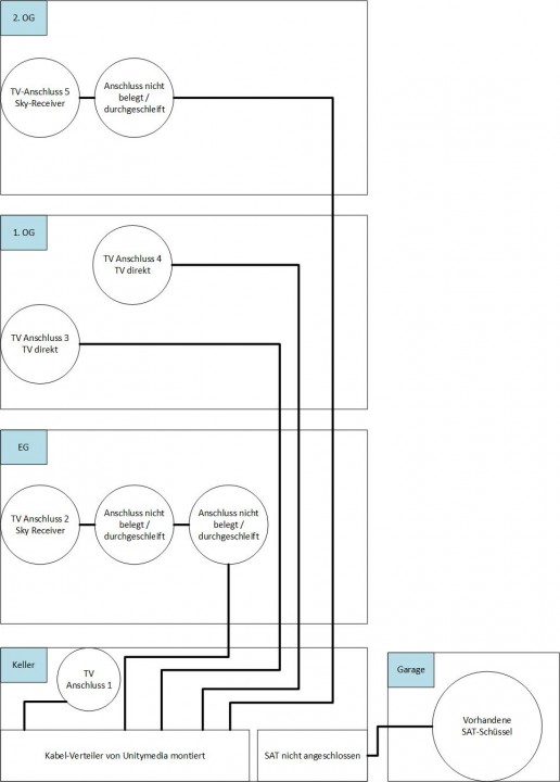 Im 2. OG ist ein TV per SKY-Receiver verbunden, ein weiterer TV-Anschluss (ob extra verbunden oder von TV-Anschluss 4 durchgeschleift ist unklar) ist direkt mit der FritzBox verbunden
