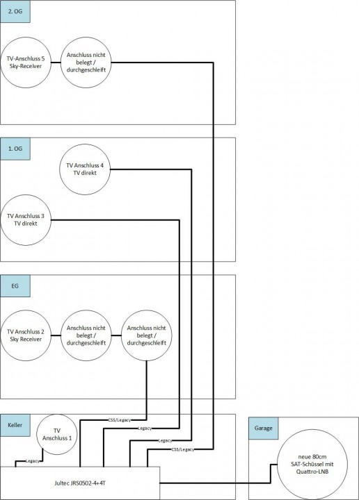 techno-com hat geschrieben:Da geht ja vom Keller ein eigenes Kabel direkt nach oben das dann nur dafür verwendet werden kann .... das also getrennt behandeln von der "Sat-Versorgung" und dort ganz raus lassen.