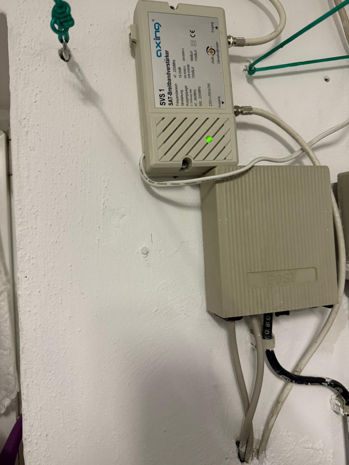 An der Sat-Schüssel ist ein LNB-Quattro mit zwei Leitungen verbaut, zudem ist noch ein Sat und terr-Leistungsverstärker mit Netzteil direkt nach dem GP31D installiert.