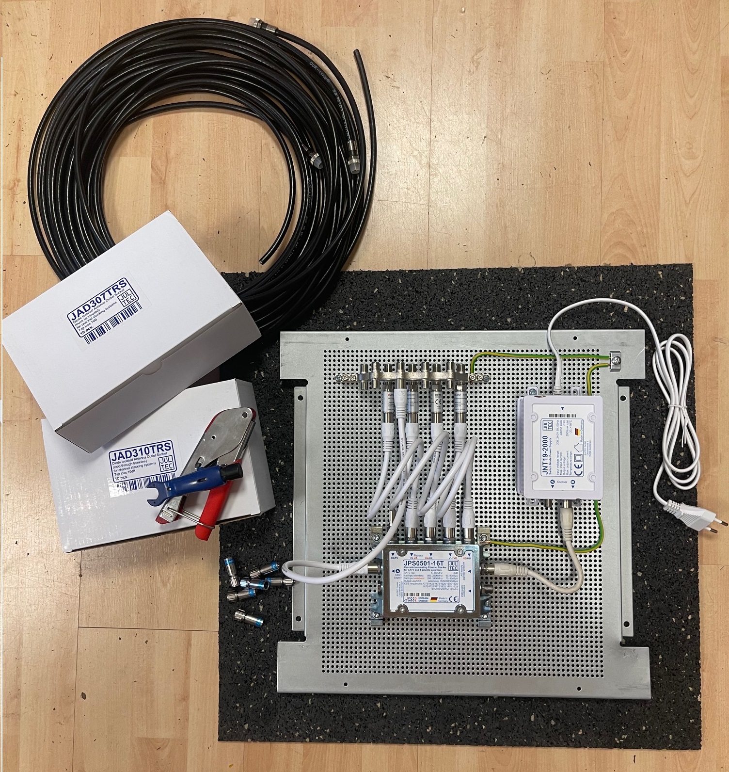 Taten ! Habe das mal aufgebaut, sieht fertig so aus (alles was aufs Lochblech gehört und noch ein Bild mit UV-beständigen Koaxkabeln, die o.g Anzahl der Antennendosen JAD-Serie und Stecker + deren Zubehör für die Montage.