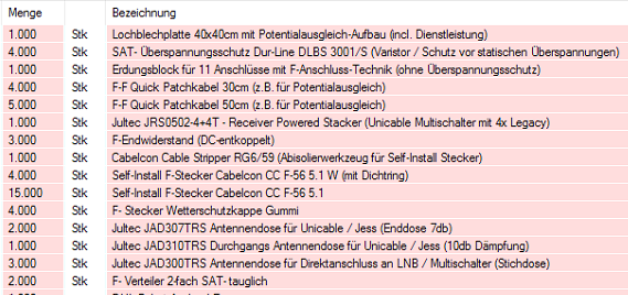 4 Stück reichen da aus wenn nur SAT-Versorgung anliegt und keine zusätzlich UKW-/DVB-T etc. Versorgung am CATV-Eingang (terrestrischer Eingang).mhritter hat geschrieben:2) benötige ich einen SAT Überspannungsschutz? ich gehe einmal davon aus - JA; ist der DUR-Line DLBS 3001/s - 5 Stück O.K.?
