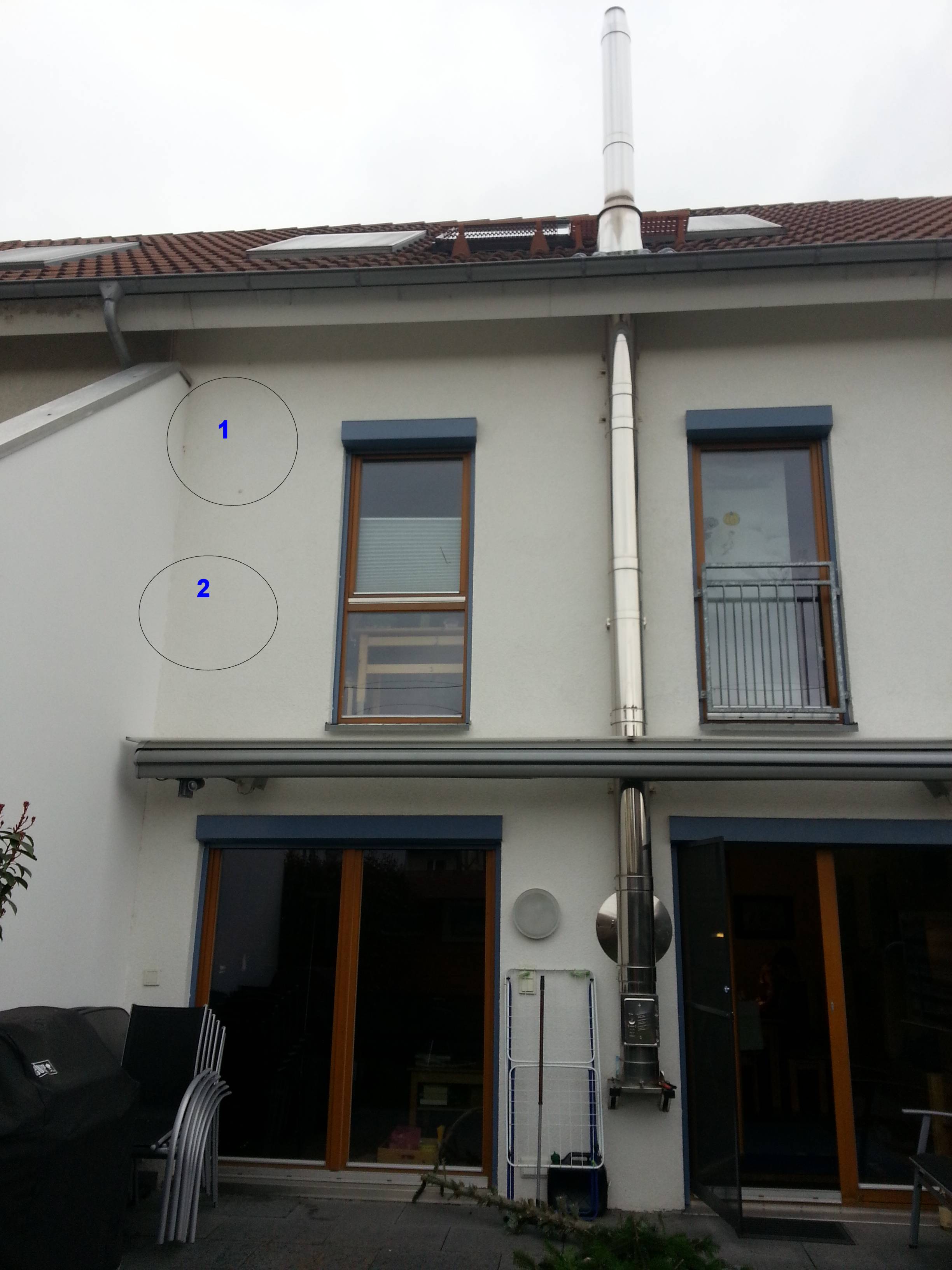 - Wand auf dem Bild ist nach Süden ausgerichtet, kein Hindernis im Weg (Position 1 bräuchte einen Blitzschutz, Position 2 wohl nicht ?)