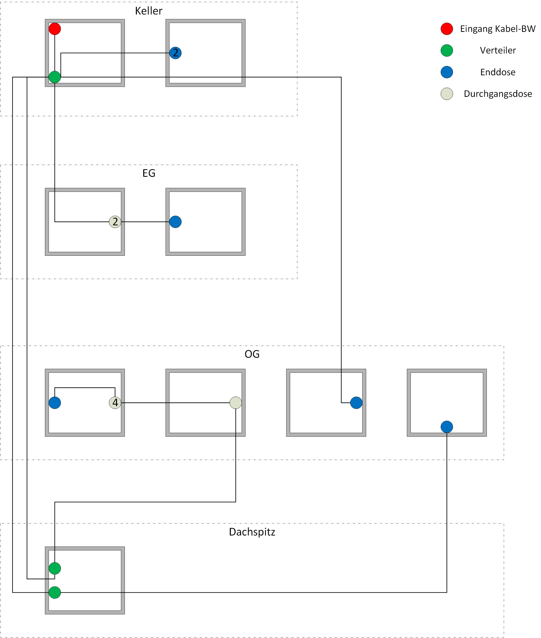 Momentan nutze ich in unserem Haus die Kabelverteilung über eine Baumstruktur. Das heisst, meine Eltern haben ein Endgerät und ich habe einen TV-Server mit einem Twin-Tuner und einem CI-Modul mit dem ich das TV-Signal per Lan in meiner Wohnung an die gewünschten Endgeräte verteile. Das bedeutet, jedes Zimmer verfügt über einen LAN-Anschluss.
