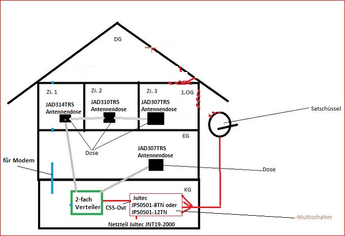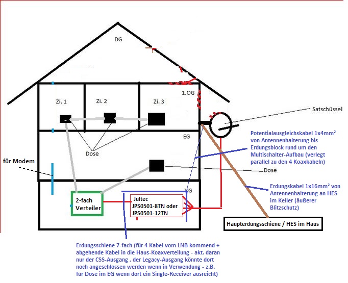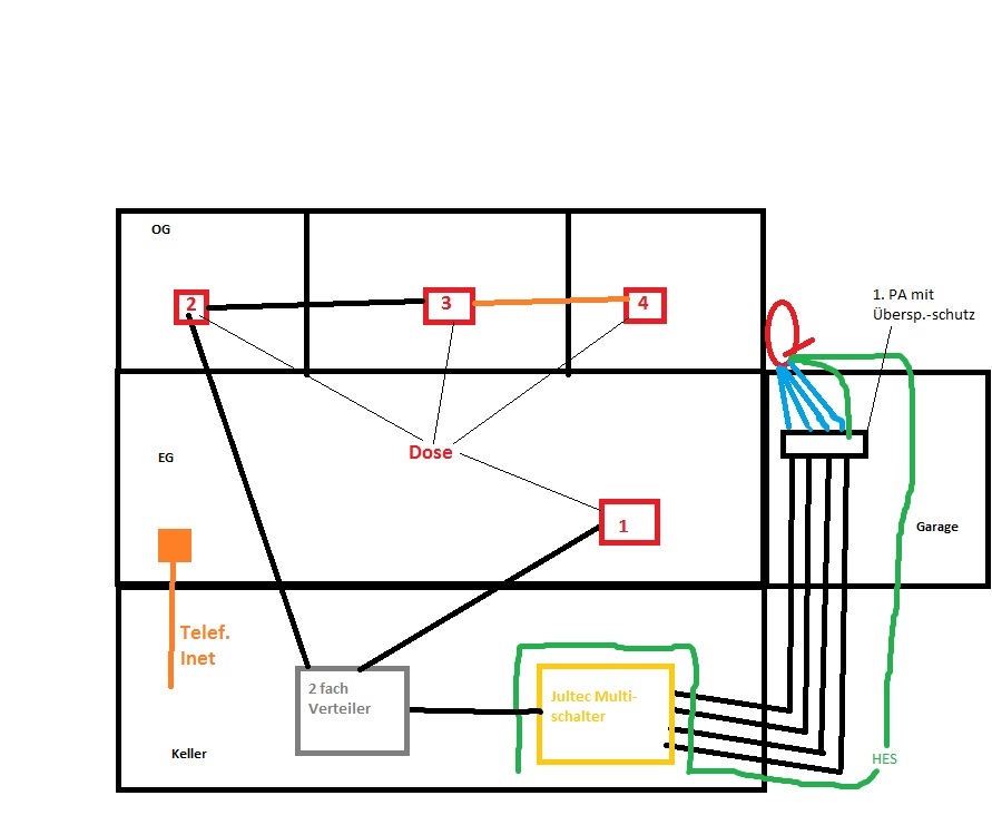 Ja, dabei würde ich aber ggf. überlegen das "rückwärts" zu machen, also von unten her (Keller am benötigten 2-fach Verteiler bzw. sogar an der Antennendose im EG ?!) einzuspeisen ! Würde die Verkabelung nach oben in den "nicht-Blitz-geschützten Bereich" wegfallen lassen .... Was aber in ihrer Zeichnung absolut aktuell fehlt ist die Verkabelung zwischen Dose 1-3 im OG ? Da fehlt die Einzeichnung wie deren Verkabelung GENAU ist !Interloper hat geschrieben:- Ist die Verkabelung so machbar wie ich mir das vorstelle?