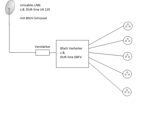 Ich meine dass der Aufbau funktionieren sollte. Der Unicable-LNB müsste bis zu 24 Teilnehmer unterstützen. Dazu wird das Signal evtl verstärkt und danach aufgesplittet (vermutlich zu 8 oder 9 Antennendosen).