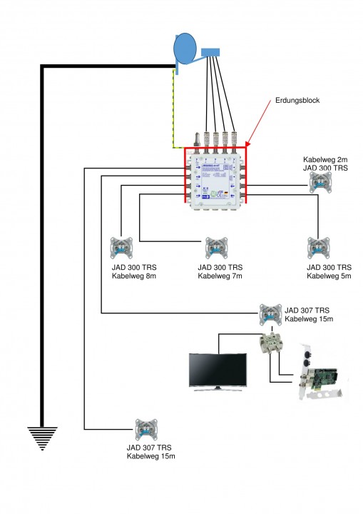 Noch ist keine Sat-Antenne montiert. Dies wird ein Fachunternehmen ausführen, in die Ausschreibung habe ich die Anforderung einer DIN-/VDE-gerechten Blitzschutzherstellung mit hineingenommen. Die Antenne kommt entweder an den Schornstein oder aufs Dach.techno-com hat geschrieben:3. wo ist die Antenne montiert, ist diese geerdet (Blitzschutz) => Erdung Satellitenanlage / Antennenmast + Potentialausgleich + Vormontagen- Aufbau im Schaltschrank incl Potenzialausgleich (Referenzbeitrag mit der ganz genauen Beschreibung dazu welcher auch alles erklärt zu UV-beständigen Koaxkabeln im Außenbereich + den Mast-nahen Potentialausgleich finden sie unter Umstieg Kabel -> SAT mit 2 Satelliten in Mehrfamilienhaus ).