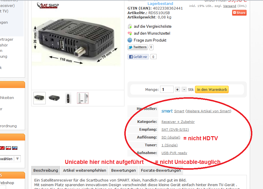 Das steht eigentlich bei jedem Receiver einmal in der Artikelbeschreibung drin, weiterhin aber kann man das auch unter dem Artikelbild rechts mit einem Blick ersehen. Siehe hier im Beispiel für die Anfrage des "Smart MX Flat" unten:Starter2 hat geschrieben:• Sind die von mir ausgewählten Receiver „Unicable“ und „HD“ tauglich?