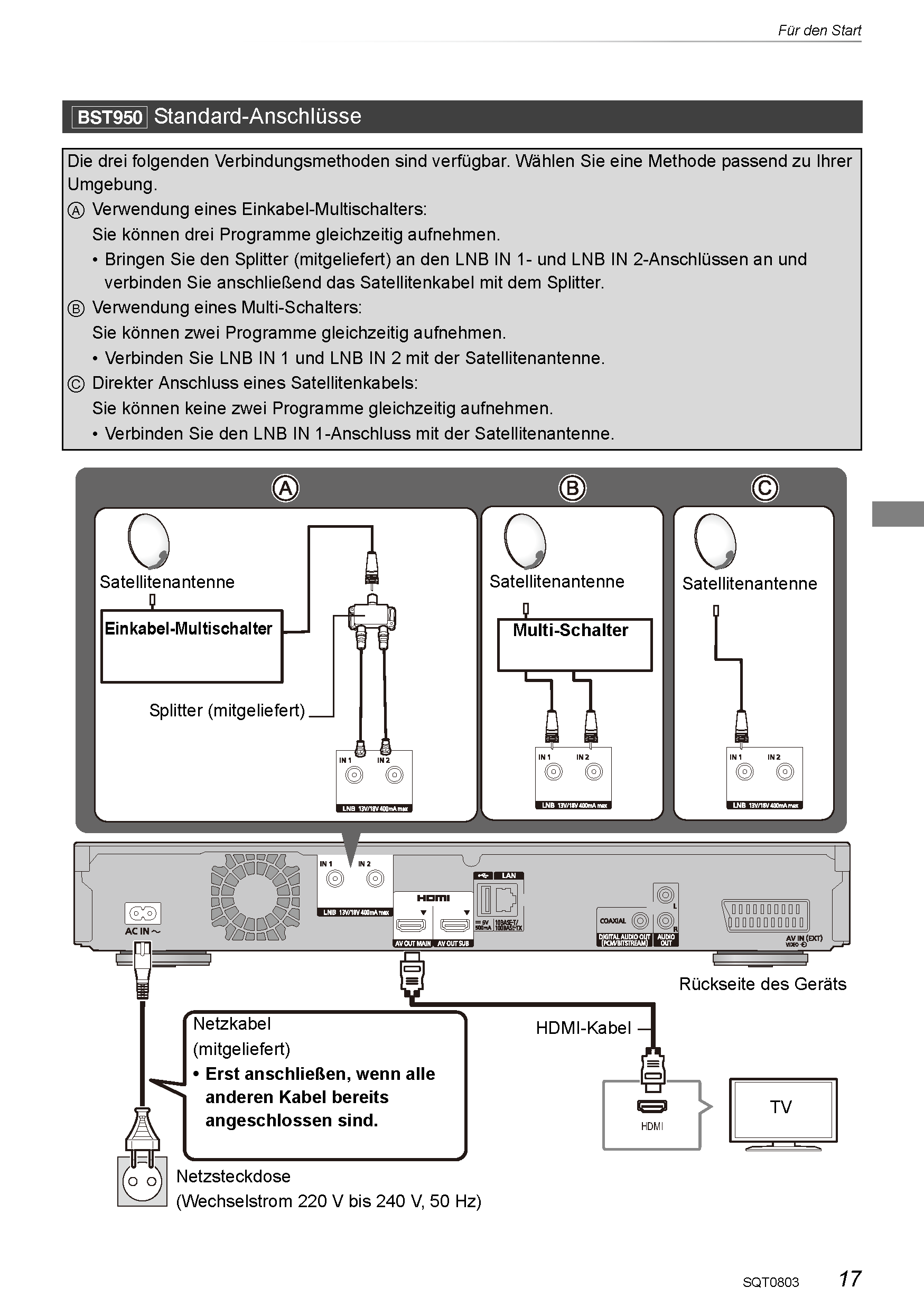 Mein Problem ist aber ein anderes: An den Ausgang A (oder B) des Multischalters habe ich eine neue Jultec JAD307 TRS als Enddose gehängt. Daran angeschlossen ist - über einen von Panasonic mitgelieferten Splitter - ein Panasonic BST950-Receiver, der im "Einkabel-Modus" genutzt werden soll, um die 3 Empfänger des Receivers ausnutzen zu können. Also: Sat-Kabel von der Enddose an den Splitter, von dort zwei Kabel an die beiden EIngänge des Receivers, wie es in der Anleitung von Panasonic beschrieben steht.