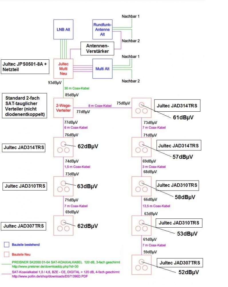 ich würde wegen den technischen Daten (Auskoppeldämpfung etc.) die Variante vorziehen ==> JPS0501-8A (mit zusätzlichem Netzteil wie zuvor in einem Beitrag geschrieben) und dahinter dann einen JRM0508T.chrisp hat geschrieben:Welcher der beiden Multischalter sollte das Kaskadierte Element sein? (Ist das Prinzipiell egal?)