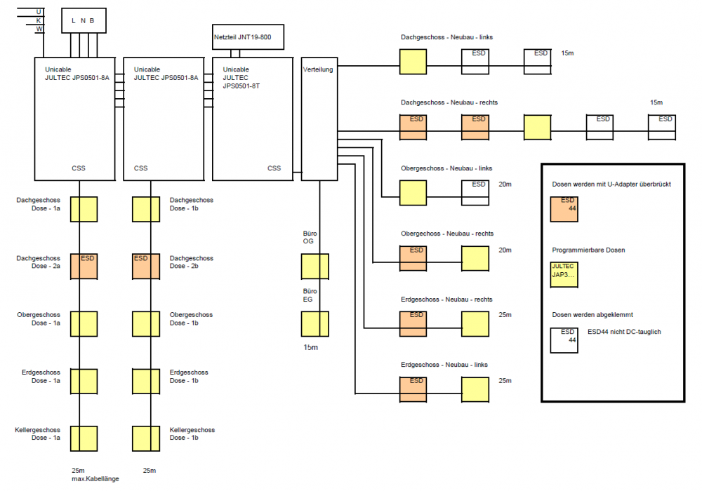- welche der Geräte sind wirklich "aktiv" und wo soll dort eine "Twin-Versorgung" hergestellt werden wo man dann auch einen Twin-Receiver voll versorgen kann ? Hintergrund ist das es doch, vor allem im ganz rechten Strang, sehr viele Anschlussplätze sind die in Betrieb genommen werden sollen an nur einem JPS-System mit 8 Umsetzungen ! Hier sollte man ggf. mal drüber nachdenken z.B. am rechten Strang einen Jultec JPS0501-12MN einzusetzen der 12 Umsetzungen für die Versorgung dann von 12 Tunern raus gibt, ist kein großer Mehrpreis ! Die Umsetzungen 9-12 (die 4 "mehr" eben) können dann aber nicht via Unicable (EN50494) angesteuert werden, diese Geräte die darauf zugreifen müssen JESS-tauglich sein (EN50607 => Was ist JESS (Jultec Enhanced Stacking System/DIN EN 50607)? ) was ja aber schon sehr viele Geräte schon sind, z.B. mittlerweile auch die Linux-Enigma² Geräte (VU+, Dreambox, Opticum etc. etc. => JESS (EN50607) auf Linux-Enigma² Geräten (Dreambox, VU+...) )