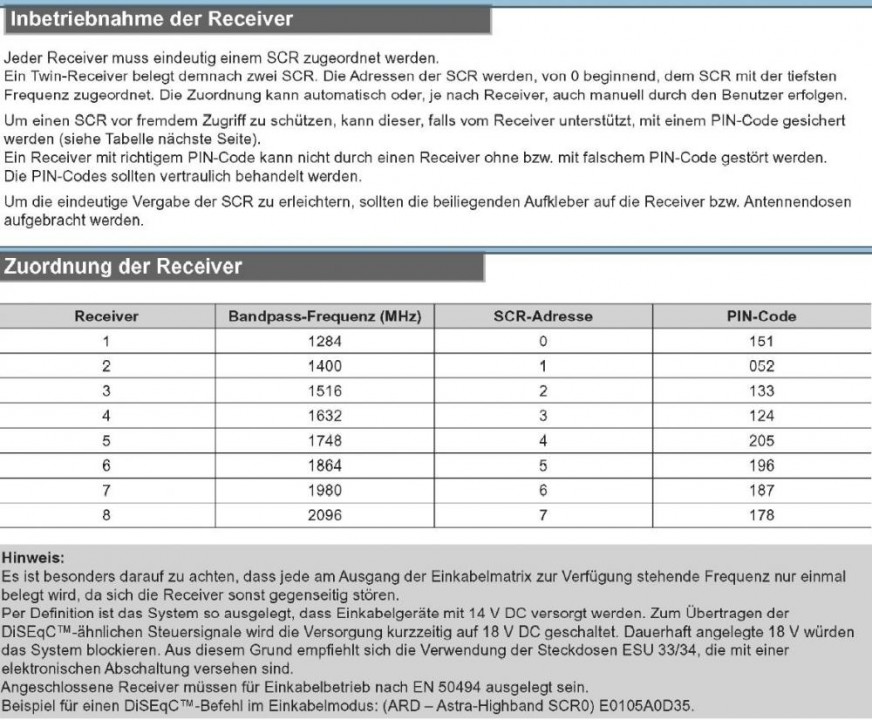 ACHTUNG: die Unicable-/JESS-ID bzw. der Unicable-/JESS-Kanal (verschiedene Benennungen von Receiver zu Receiver) muss bei der Programmierung des Receivers auch eingehalten werden, diese ist aber sehr abweichend zwischen div. LNBs/ Multischaltern bzw. auch unter den Herstellern.