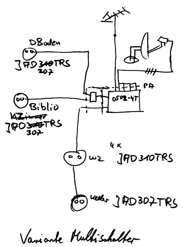 Ich schwanke nun zwischen dem Einsatz eines Einkabel LNB (Anadol mit 1* 8 Unikabel, 2 * Legacy als Reserve/Alternative) mit einem 1 auf 3 Verteiler oder einem Multischalter (Jultec JRS0502-4T) mit einem 1 auf 2 Verteiler. Es soll keine zusätzliche Stromversorgung notwendig sein. Ich habe beide Varianten mal mit Hand skizziert, siehe Anhang.