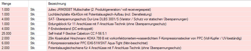 Es gehört mehr dazu als nur eine Antenne, ein LNB und ein Multischalter .... angefangen bei UV-beständigen Koaxkabeln im Außenbereich bis hin zur richtigen Antennendose/Erdungsmaterial etc. etc. etc. wird alles in diesen ausgewählten oben verlinkten Beiträgen erklärt.