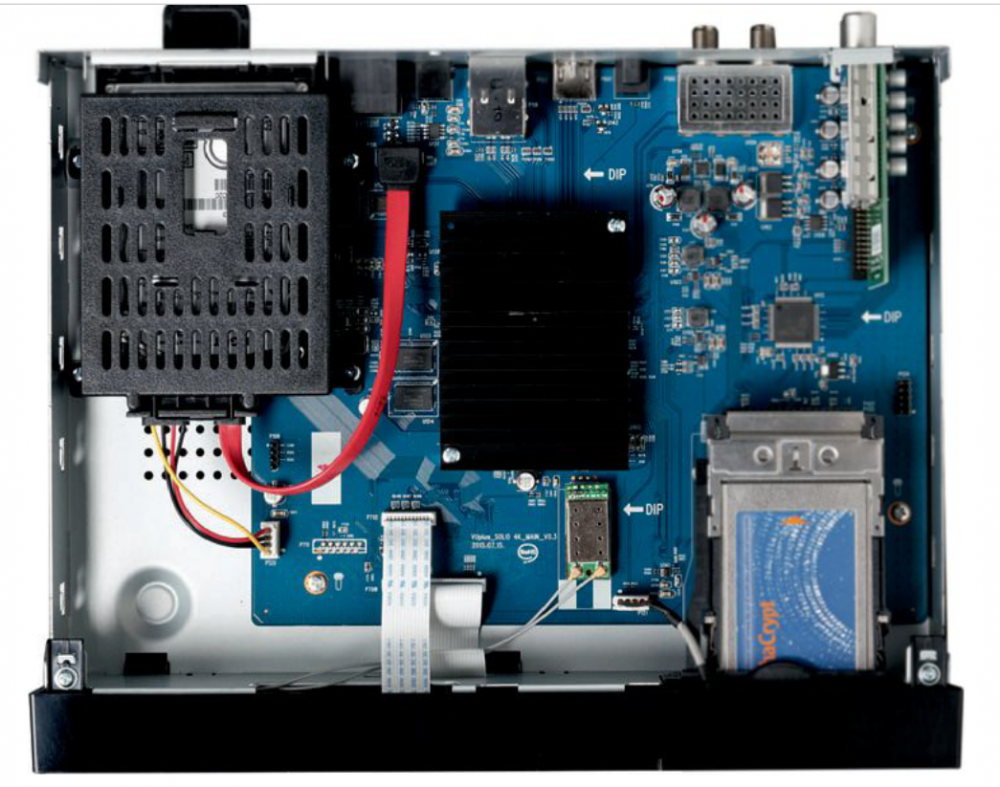 Bild einer VU+ Solo 4K mit geöffnetem Deckel (Innenansicht Mainboard) ...... wie man sieht wird sie ohne internen Lüfter gebaut, Netzteil ist extern. Gut zu erkennen ist der HDD-Wechselrahmen (oben links) und die fest verbauten FBC DVB-S2 Tuner + ein gesteckter modularer Extra-Tuner (oben rechts).