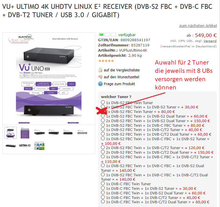 Das die VU+ Ultimo 4k mit 2x 8 UBs versorgt werden kann muss die unten genannte (siehe Bild in der Anlage) Tuner-Variante gewählt werden