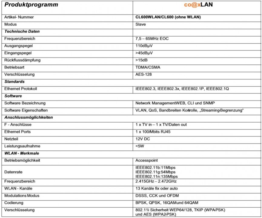 CoaxLAN CL600WLAN aufsteckbares Powerline Modem 600 MBit/s WLAN 4 SSID's RJ45
