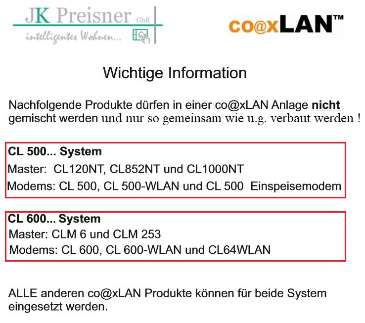 Die coaxLAN Modems der Serie 5... und der Serie 6... dürfen in einer Anlage NICHT gemischt werden !!!