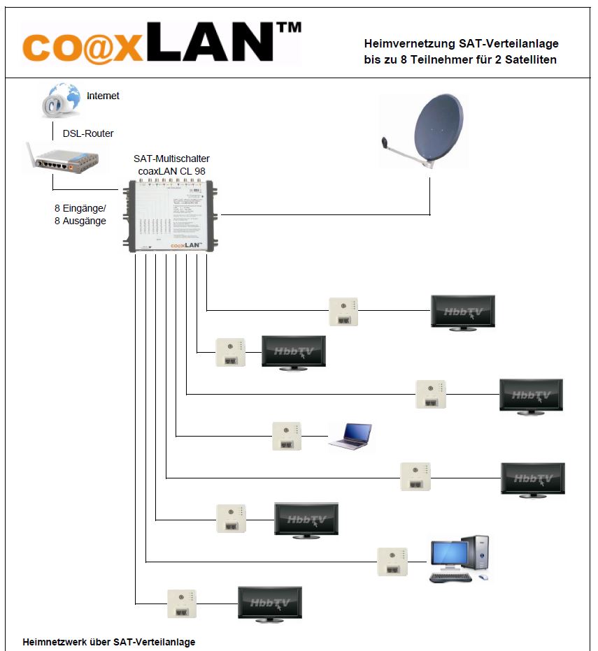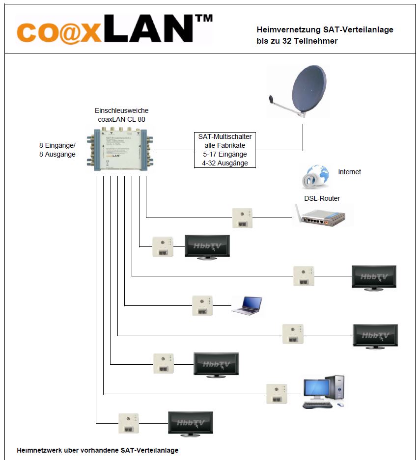 Nutzung der bestehenden Antennenverkabelung (Kabel/SAT/DVB-T) durch co@xLAN Internet direkt am TV bzw. an der HbbTV Settopbox ohne störanfälliges WLAN (kein Elektrosmog).