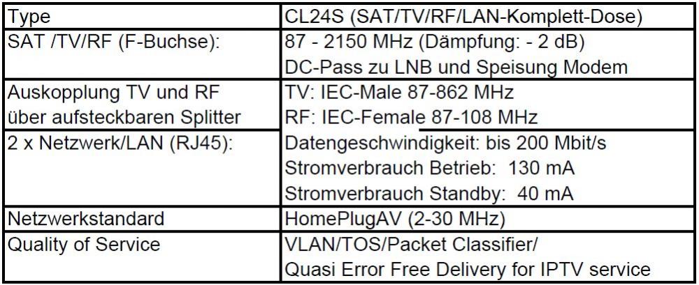 co@xLAN CL24S aktive 200 MBit SAT/TV/RF/2xLAN Antennendose technische Daten
