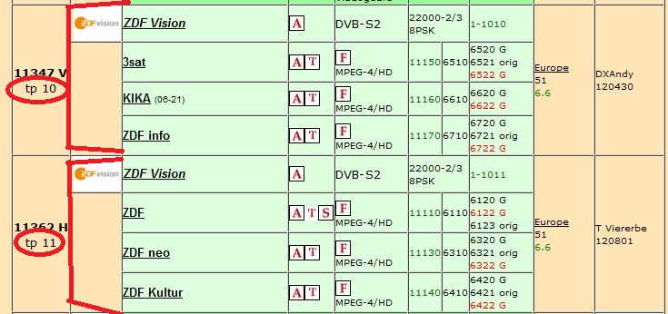 Was ist ein Transponder (auch "TP" genannt) ? In diesem Bild werden 2 Transponder dargestellt (TP 10 + 11). Es befinden sich jeweils 4 Programme auf einem Transponder in diesem Beispiel. Eine Übersicht der Transponder-Belegung kann man z.B. für Astra 19 Grad Ost hier ersehen (auf anderen Seiten dort auch für jeden anderen Satelliten).