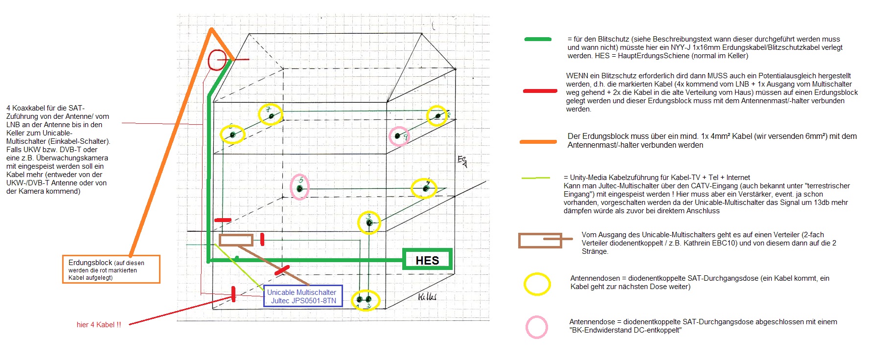 WENN sie also in diesem Bereich instalieren möchten/müssen dann MUSS das gemacht werden ! Den Potentialausgleich empfehle ich auch in dem Fall das keine Erdung der Antenne vorgenommen werden muss, der Anschlusspunkt für das Kabel weg von dem Erdungsblock verschiebt sich dann und muss nicht am Antennenmast angeschlossen werden, sondern direkt an der HES im Keller (ist dann natürlich viel einfacher und näher !).