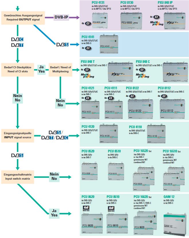 PAL/QAM/COFDM Aufbereitung einzelner Programme oder ganzer Transponder in DVB-S2, DVB-C und auch in DVB-T.