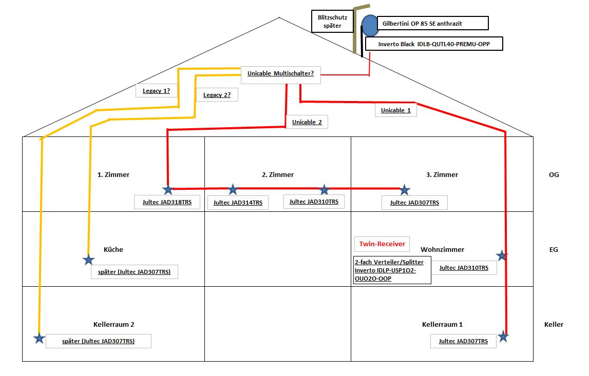 Für die Pegelberechnung wäre aber auch der Kabeltyp und die ganzen Entfernungen von Unicable-Schalter zu jeder Dose wichtig.