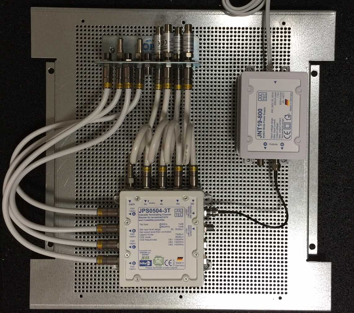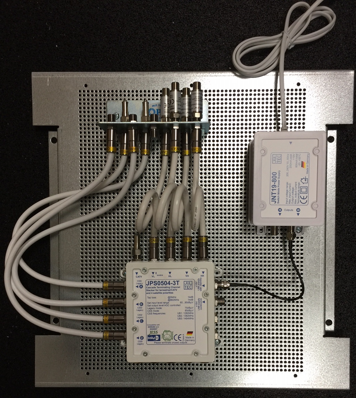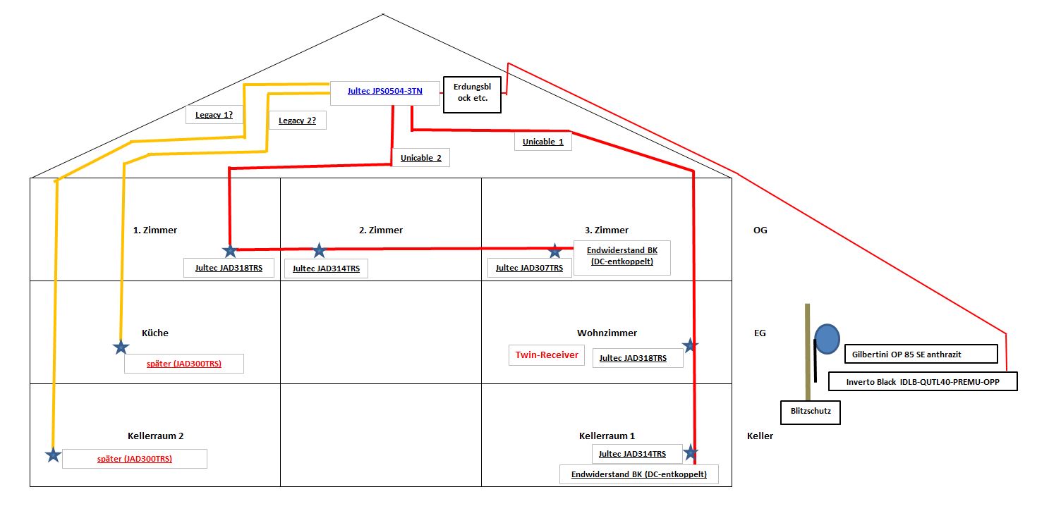 Strang Unicable 2: Jultec JAD318TRS => Jultec JAD314TRS => Jultec JAD310TRS => Jultec JAD307TRS (letztere muss NICHT mit einem BK-Endwiderstand abgeschlossen übrigens, das ist bereits eine "wahre Enddose", also schon intern terminiert)