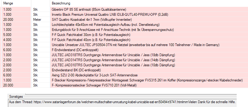 Da fehlen die Patchkabel und ggf. F-Endwiderstände um offenen Ein-/Ausgänge am Multischalter abzuschließen:Maik12345 hat geschrieben:1x Lochblechplatte 40x40cm mit Potentialausgleich-Aufbau (incl. Dienstleistung)